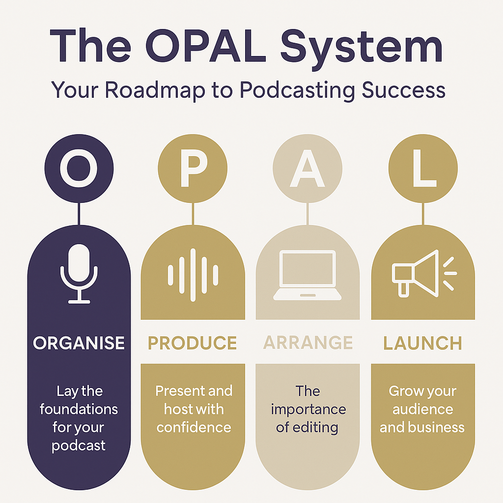 The OPAL System by Rose Davidson is a proven framework to help podcasters create, grow, and monetize their shows. With four core steps—Organize, Produce, Arrange, and Launch—this system streamlines the podcasting journey, providing clear guidance and actionable strategies. Whether you’re starting fresh or elevating your existing show, the OPAL System ensures a seamless path to podcasting success.